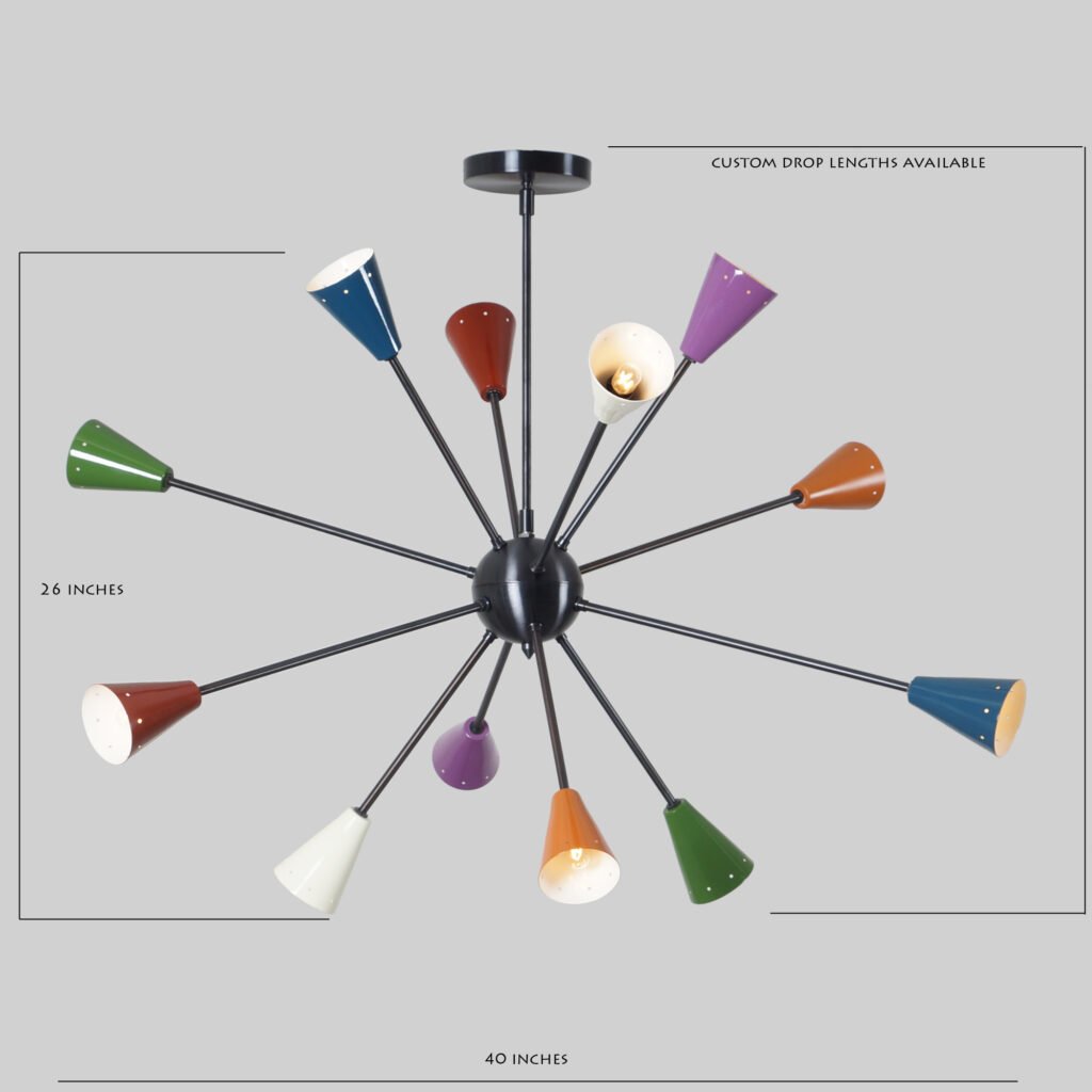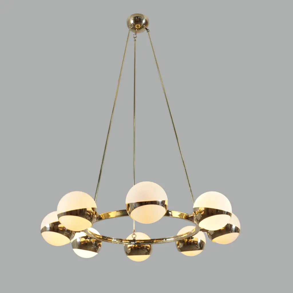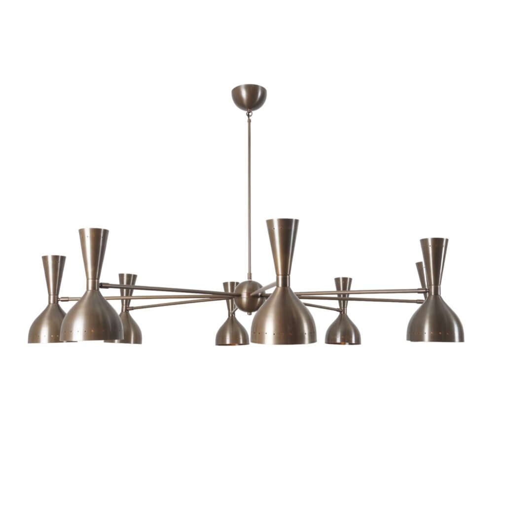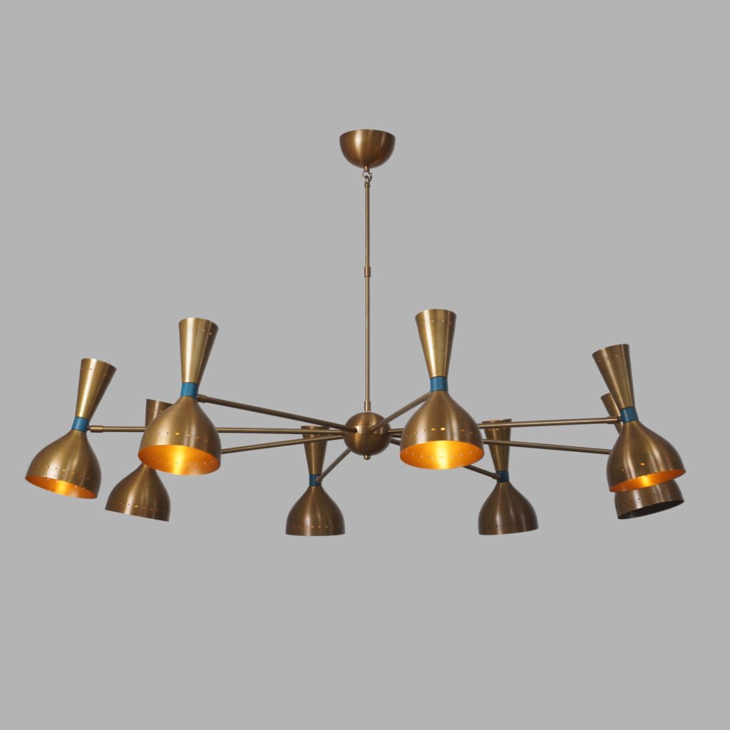 The out-of-this-world design of the Cosimo Grand Chandelier is supersized in a new over scaled version. Brass curled discs float effortlessly under the space-like dome. Both lower levels hold lights, creating a soft glow.