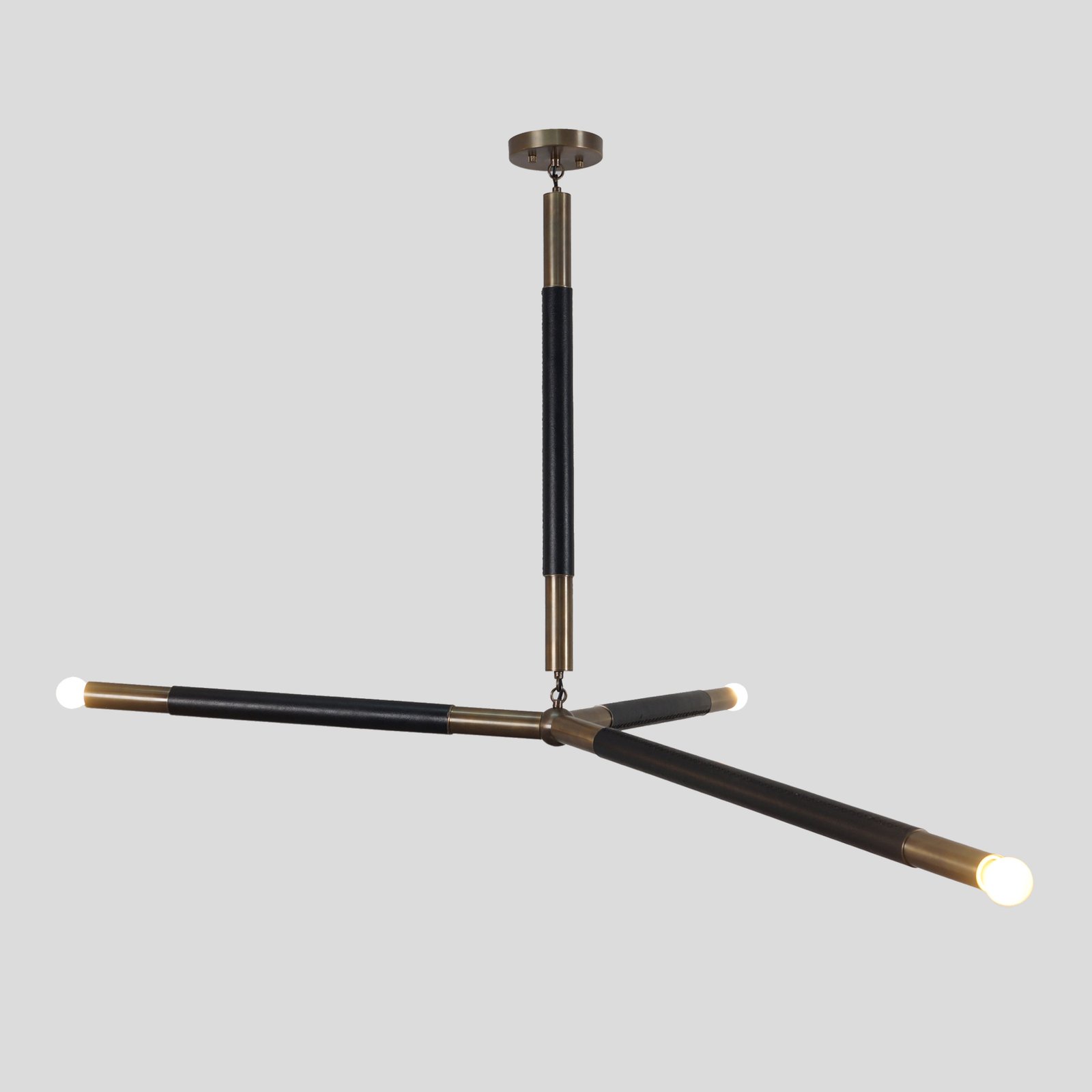A simplified drawing of an arrow, which looks like a straight line with a triangle at the end. Counterweights built into the structure are hidden and affect its direction. Arrow Large Chandelier Ceiling Lamp Made of brass, with hand-wrapped calfskin leather. Through its long shape and clean, symmetrical look, the Arrow Large Chandelier Ceiling Lamp embodies the spirit of an arrow. The clean lines and balanced proportions of this piece show the beauty of minimalist design.